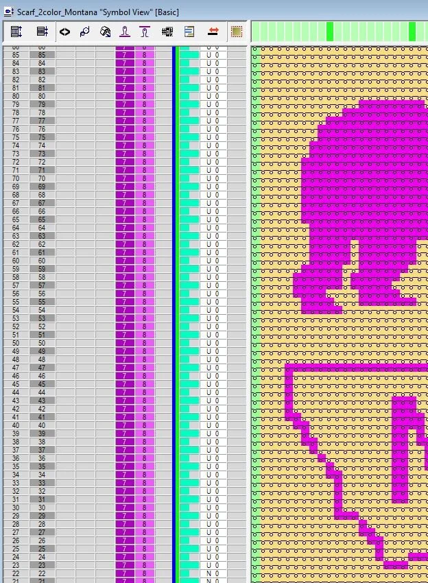 Before knitting can begin, the design is transformed to the canvas, which is a computer software specifically designed for our machine. Many steps are involved to design, program and check the pattern, stitch length, speed and many more settings to ensure the scarf will knit successfully.